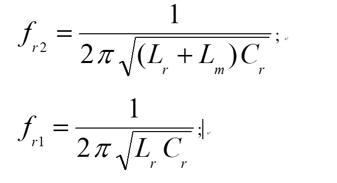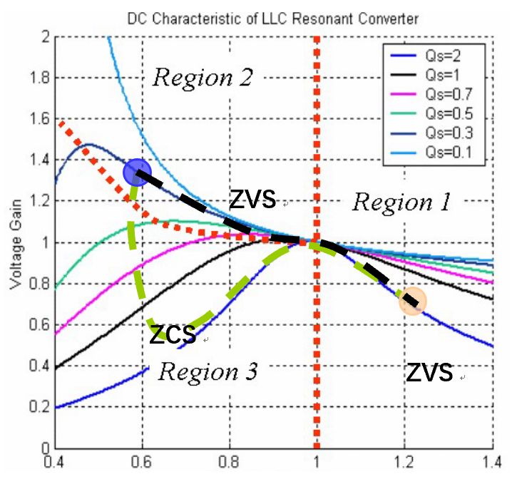 当fs≥fr1 时,LLC就像一个串联的RC谐振腔; 这种功能出现在高负载条件下,即当Lm与低阻抗并联时;当fr2≥fs时,LLC类似于并联RC谐振腔,这功能出现在低负载条件下。系统通常不在这个区域工作,因为可以在ZCS条件下运行。如果频率fi在fr2< fi < fr1范围内,则两个功能同时存在。