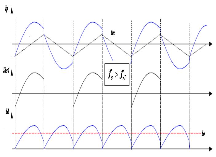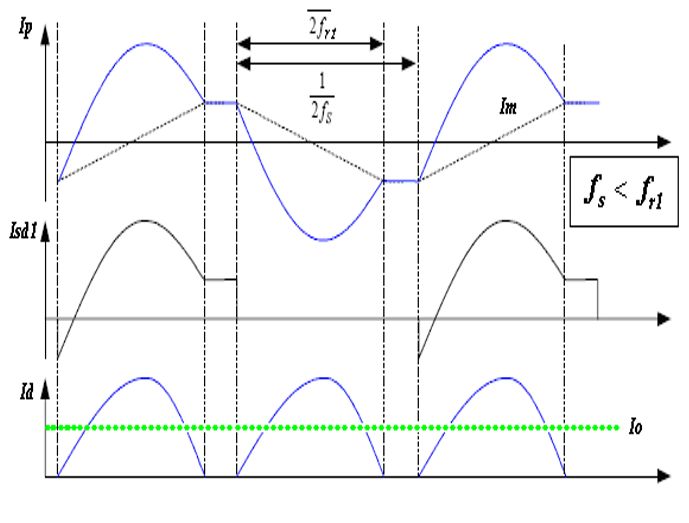 如果MOSFET开关频率fs小于fr1,功率器件上的电流的形状会改变。事实上,如果持续时间足以在输出二极管上产生不连续的电流,则原边电流形状会偏离正弦波形。