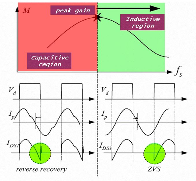 分析一下谐振频率的方程式就会发现,在高于峰值增益频率时,谐振网络的输入阻抗是感抗,谐振网络的输入电流(Ip)滞后于谐振网络的输入电压(Vd)。在低于峰值增益频率时,谐振网络的输入阻抗变为容抗,并且Ip领先Vd。在电容区工作时,体二极管在MOSFET开关期间执行反向恢复操作。